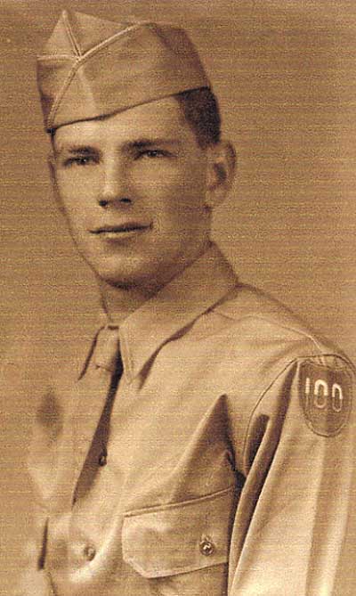 SERVED AS A CORPORAL IN COMPANY K, 397TH INFANTRY REGIMENT, 100TH (CENTURY) DIVISION. AWARDED THE BRONZE STAR, COMBAT INFANTRYMAN BADGE, PURPLE HEART AND 4 CAMPAIGN RIBBONS.