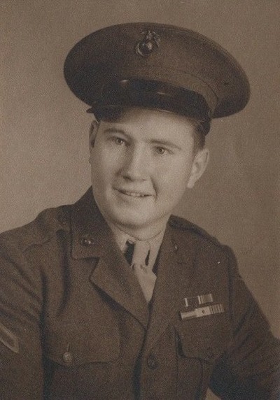 DRAFTED INTO THE MILITARY, HE REPORTED TO THE DALLAS, TEXAS INDUCTION CENTER. HE WAS GIVEN A CHOICE OF BEING DRAFTED INTO THE ARMY AND RETURNING AT A LATER DATE TO BE SHIPPED OUT FOR TRAINING; OR JOIN THE MARINES AND SHIP OUT IMMEDIATELY. HE JOINED THE MARINES AND SHIPPED OUT FOR BASIC TRAINING, SAN DIEGO, CA. HIS NEXT TRAINING WAS HEAVY EQUIPMENT OPERATOR AT CAMP LEJEUNE, NORTH CAROLINA. ONCE HE COMPLETED THIS TRAINING HE WAS SHIPPED BACK TO SAN DIEGO, CALIFORNIA AND ASSIGNED TO A CASUAL COMPANY, AWAITING ORDERS FOR OVERSEAS DEPLOYMENT. SOON HE WAS ON HIS WAY TO HIS FIRST OVERSEAS ASSIGNMENT, ASSIGNED TO AN ENGINEERING BATTALION STATIONED IN THE SOLOMON ISLANDS. HIS COMPANY WAS THEN LOADED ON CONVOY SHIPS HEADED TO OKINAWA, JAPAN. HIS COMPANY WAS LOADED ON A CARGO SHIP AND THE MARINES WERE ALL ASSIGNED TO QUARTERS IN THE BOW OF THE SHIP. BECAUSE OF THE ROUGH SEAS AND ALL THE TROOPS BELOW DECK BEING SEASICK, HE OPTED TO SLEEP OUT ON THE DECK, UNDER THE STARS. ON APRIL 1, 1945, D-DAY, HE LANDED ON OKINAWA, ENCOUNTERING NO ENEMY CONTACT. ON MAY 5, 1945, THE HEAVY FIGHTING HAD NOT YET BEGUN. HE WAS ASSIGNED TO A BULLDOZER WITH ONE OTHER MARINE. THE BULLDOZER WAS FITTED WITH A HEAVY STEEL BOX OVER THE DRIVER. THEY WERE ASSIGNED TO PREPARE A CROSSING OVER A CREEK. IT WAS VERY HOT INSIDE THE BULLDOZER CAGE, SO EVERY HOUR THEY WERE TO ROTATE OUT AND THE OTHER DRIVER TAKE OVER FOR AN HOUR, SO THEY COULD RECOVER FROM THE HEAT. JUST AS HE TRADED WITH THE OTHER DRIVER A VERY LARGE 'BELL MINE' EXPLODED KILLING THE DRIVER AND ALMOST SEVERING HIS LEFT ARM. SOON AID ARRIVED AND THE ONE CHECKING THE BULLDOZER YELLED OUT, 'THIS ONE'S DEAD.' THE ONE CHECKING HIM OUT YELLED BACK, 'THIS ONE'S DEAD TOO.' TO WHICH HE REPLIED, 'NO I'M NOT,' ALMOST CAUSING THE MARINE ASSISTING TO HAVE A CORONARY. HE WAS TAKEN TO THE NEAREST FIELD HOSPITAL, WHERE THEY WERE ABLE TO SAVE HIS ARM AND PUT HIM IN A FULL BODY CAST. HE WAS THEN FLOWN TO THE NAVY HOSPITAL IN GUAM AND THEN TO PEARL HARBOR, HAWAII FOR TREATMENT. BASED ON THE SEVERITY OF HIS WOUND HE WAS TAKEN TO THE NAVY HOSPITAL IN OAKLAND, CALIFORNIA AND LATER TO THE NAVY HOSPITAL IN COEUR DE LANE, IDAHO, WHERE HE WAS FITTED WITH A NEW, FULL BODY CAST. NEXT HE WAS SENT TO THE NAVY HOSPITAL IN NORMAN, OKLAHOMA, WHILE THERE THE WAR WAS OVER AND THE MILITARY STARTED CLOSING HOSPITALS. HE WAS THEN SENT TO THE VETERANS ADMINISTRATION HOSPITAL IN DALLAS, TEXAS, WHERE THEY CUT OFF HIS CAST AND PERFORMED ADDITIONAL SURGICAL PROCEDURES. AFTER RECOVERING FORM THE SURGERY HE WAS TOLD TO GO HOME FOR A COUPLE OF WEEKS AND THEN REPORT BACK. HE WANTED NOTHING MORE TO DO WITH HOSPITALS AND NEVER RETURNED. HE WAS DISCHARGED FROM THE MARINE CORPS IN JUNE 1946. HE WAS AWARDED THE PURPLE HEART, MARKSMANSHIP BADGE AND ASIATIC - PACIFIC CAMPAIGN RIBBON.