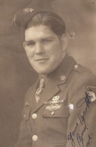 INDUCTED; MAY 10, 1943. SERVED WITH COMPANY D, 327TH GLIDER INFANTRY. HEAVY MACHINE GUNNER, 101ST AIRBORNE. QUALIFIED GLIDER PILOT. BATTLES AND CAMPAIGNS: NORMANDY, ARDENNES, RHINELAND, CENTRAL EUROPE, GLASGOW AND HOLLAND. INJURED BY SHRAPNEL IN THE THIGH; SEPTEMBER 19, 1944. DECORATIONS AND CITATIONS: COMBAT INFANTRYMAN BADGE, GLIDER BADGE, PURPLE HEART, UNIT CITATION, AND EUROPEAN-AFRICAN-MIDDLE EASTERN THEATER MEDAL WITH 4 BRONZE SERVICE STARS AND BRONZE ARROWHEAD.