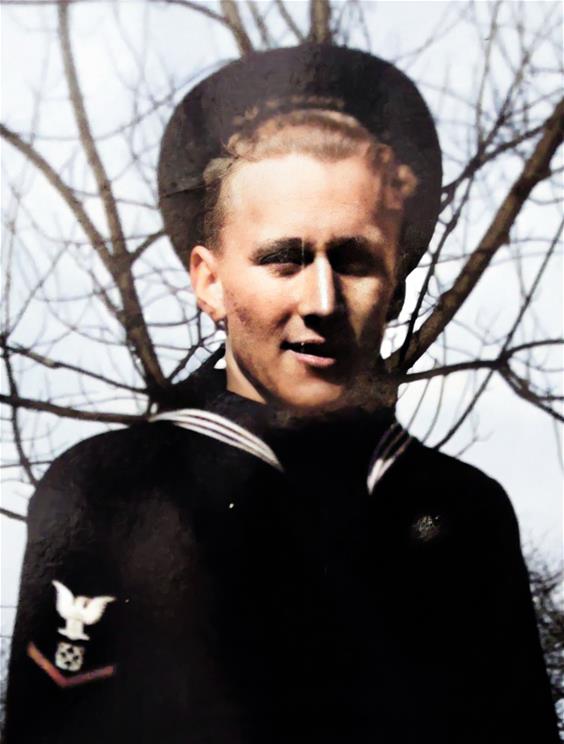 Drafted into the Navy in June 1943 and reported to the Great Lakes Training Naval Station in Illinois. After boot camp training he went to Hawthorne NV to a Navy Ammunition Depot where they unloaded ammunition off the trains and stored it in the ammunition magazines. On December 6, he was transferred from the Depot to Port Hueneme in California. There they were outfitted for overseas equipment and December 12 went aboard the USS Celeno (AK-76) a crated class cargo ship and headed for the South Pacific. After arriving on the island of Espiritu Santo in the Caroline Islands he drove a truck engaged in stevedore hauling freight from the ship to storage buildings. He then went from Espiritu Santo to the Green Island, a little horseshoe shaped island off the coast of New Guinea. There was a bomber strip and squadron of B24’s, F4U’s and torpedo bombers on the island. His primary duty was to maintain the living and dining quarters for the pilots and crews. Later he left the Green Islands and went to the Admiralty Islands where he was assigned to the seaplane base fire department. He returned to the United States arriving in Seattle WA December 28, 1945. From there he went to Long Island NY.