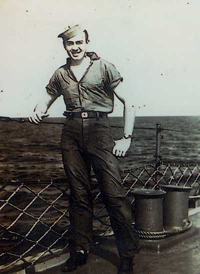 RADIOMAN 2ND CLASS. IN THE SOUTH PACIFIC ABOARD THE USS SIGSBEE DD502. LATER SERVED WITH ADMIRAL W. F. HALSEY IN THE 3RD FLEET AS RADIOMAN. WITNESSED THE SIGNING OF THE SURRENDER CEREMONY OF THE JAPANESE FORCES ABOARD THE USS MISSOURI BB63, ON SEPTEMBER 2, 1945.